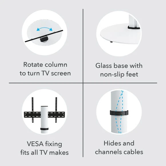 The Eno TV stand is a great solution for mounting your TV without a large unit taking up vital floor space. This stand can fit along a flat wall or in a corner. Customise your viewing preference by rotating the base and tilting the TV to the angle you need. Keep any stray cables neat and tidy with the integrated cable management.