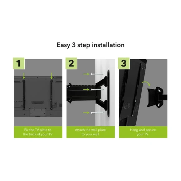 Your TV can now be fully adjusted to your viewing preference! Hang your TV on this multi-position mount and angle your TV to how you desire. The TV mount has a tilt feature along with two pivot points to help you find the perfect angle. This mount is great for using in the corner of a room. It has an audible click lock too.