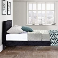 The Berlin Crushed Velvet Bed Frame is upholstered in crushed velvet fabric, creating a dramatic bedroom centrepiece, and comes complete with complementary dark wooden feet for the perfect finishing touch.