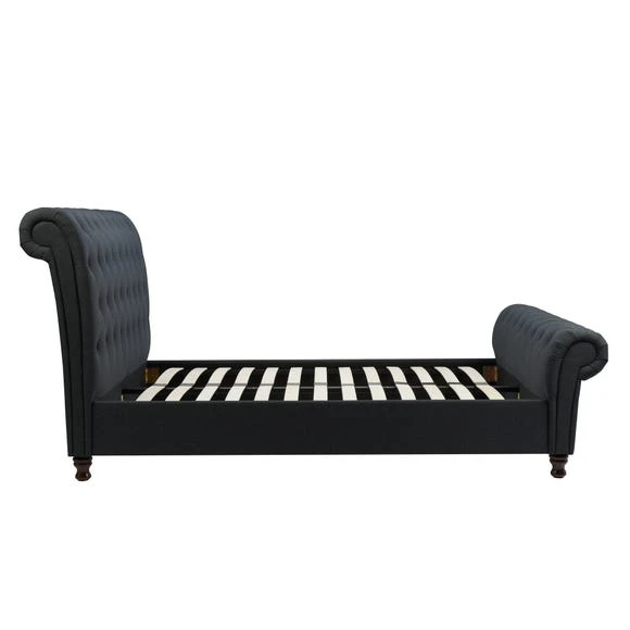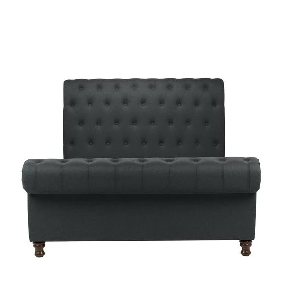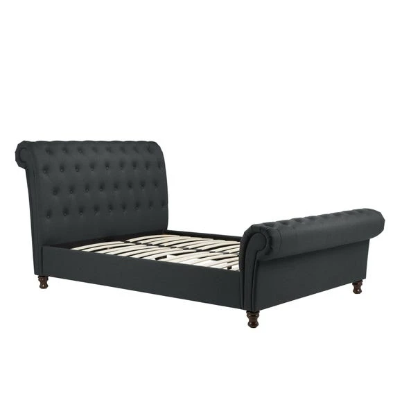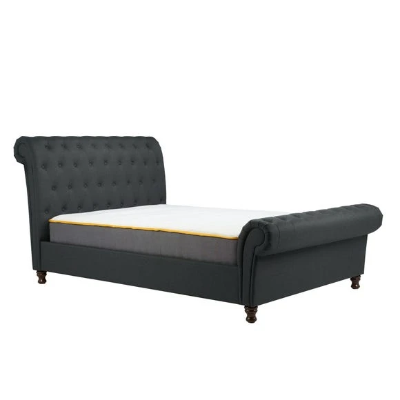 The luxurious Castello Fabric Bed Frame combines stylish buttoned detailing with a rolled headboard and footboard design, creating the perfect statement piece. It features a charcoal polyester finish with complementary dark rubberwood feet. With a sprung slatted base for natural bounce, the frame adjusts to where pressure is exerted most, providing greater comfort.