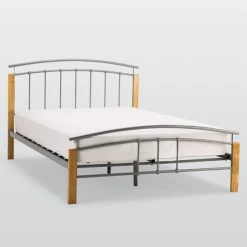 A modern bed frame with silver framework, beech posts and a slatted bed base. This contemporary bed frame will make a great centrepiece to any modern room. The silver framework and beech posts contrast beautifully while the simple yet stylish design creates a truly stunning effect.