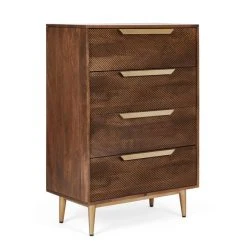 Offering a stunning, luxe design, the part assembled Anya Four Drawer Chest offers statement styling with four spacious drawers complete with carved detailing, asymmetric brass handles and matching brass legs.