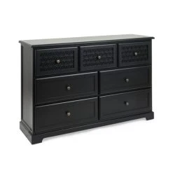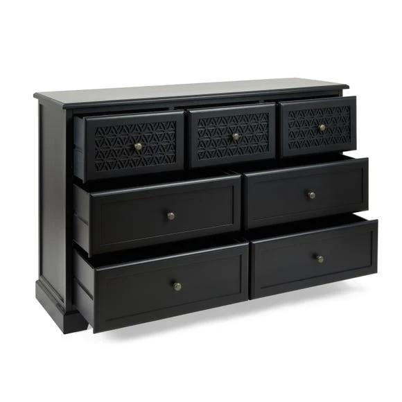 Fully assembled, the elegant Carys chest of drawers features two smaller carved front drawers and three large unpatterned drawers, complete with wooden runners and providing generous storage space.