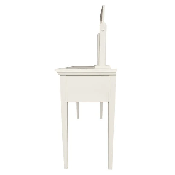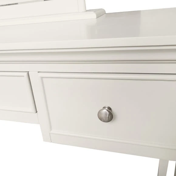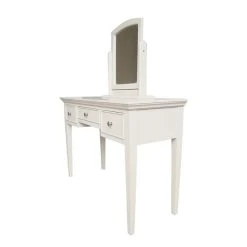 Complete with a stylish matching stool, this dressing table set features solid rubberwood legs and three ample size drawers with adjustable vanity mirror.