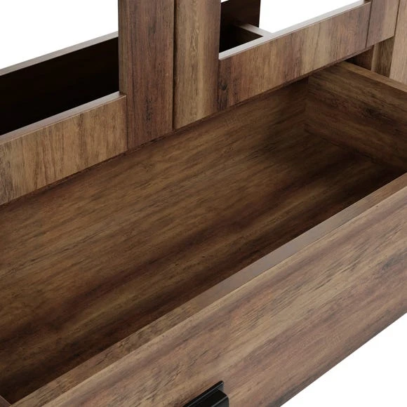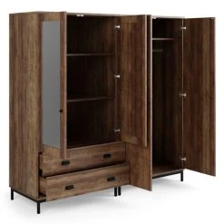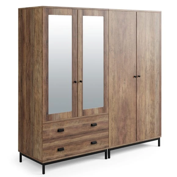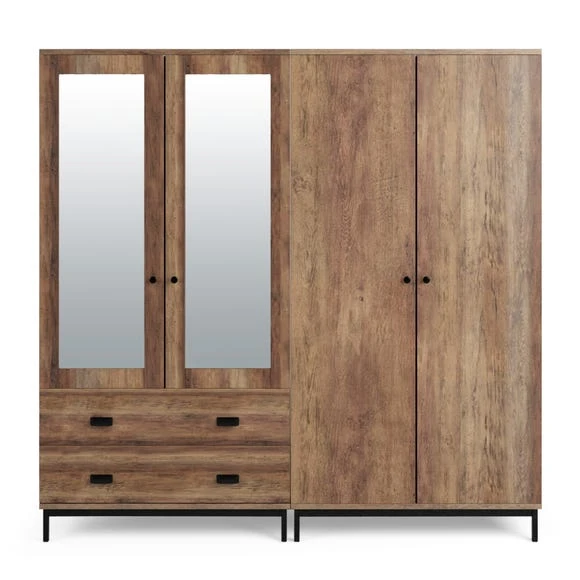 The Fulton 4 Door Wardrobe is a practical and stylish addition to any bedroom, with a rustic pine finish and black metal hardware creating an industrial look. Offering plenty of useful storage space, this Fulton wardrobe comes complete with a hanging rail, 3 spacious shelves, and 2 drawers for all your storage needs. The mirrored doors also help make getting ready a breeze.