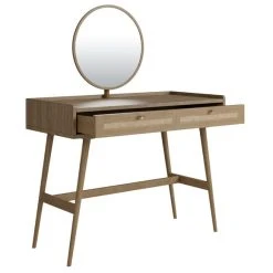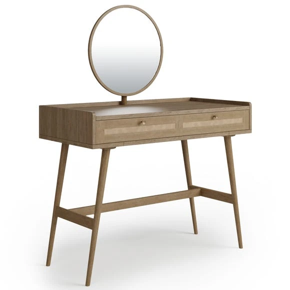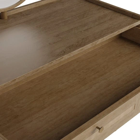 Bringing a modern flair to a retro style, the Indi range is perfect for any contemporary or global styled home. Characterised by the stunning rattan fronts and brass knobs, this range boasts a 100% mango wood construction and minimal assembly. Perfect for bringing a warm neutral feel to your home, this beautiful dressing table including an angled mirror and drawers for space to keep your bedroom clutter free. Crafted from sturdy, solid mango wood, this piece is built to last.