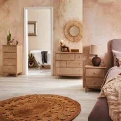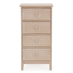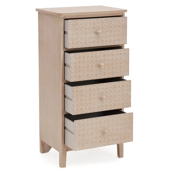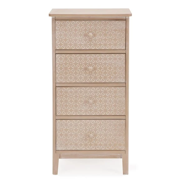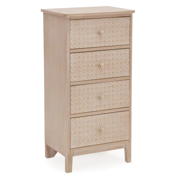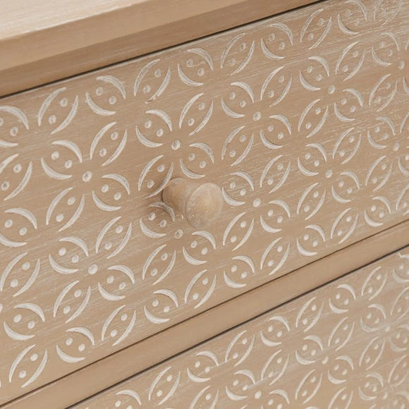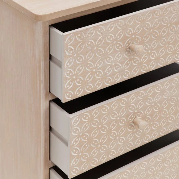 Crafted from fir wood with a white washed finish to complement the rustic styling, the Ivy tall chest of drawers features drawer fronts with a delicate floral carved pattern and solid wood handles.