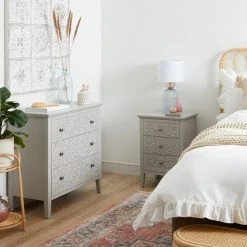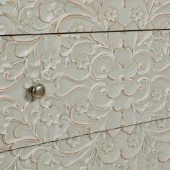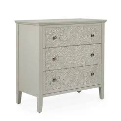 This stylish Josie Floral 3 Drawer Chest features a carved, floral pattern on the front and finished with a semi-distressed look paint finish that helps brings out the pattern. The brushed silver round handles add a minimal modern finish while the chunky, wooden legs provide a sturdy and stable base.