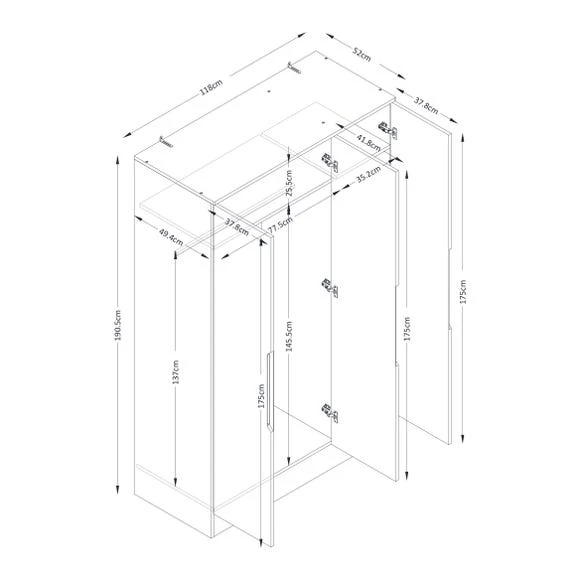 | Product Dimensions | H 190cm x W 118cm x D 52m, Hanging Space: H 145.5cm x W 76cm x D 48.4cm, Double Top Shelf: H 25cm x W 76cm, Single Top Shelf: H 25cm x W 34cm |