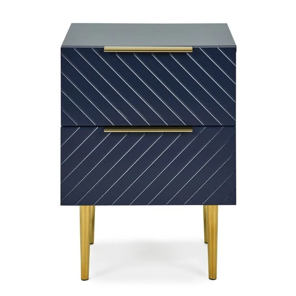 Match the elegance and grandeur of Gatsby himself with our Maurice bedside. Inspired by Art-Deco styles, this navy bedside combines the geo vibes of the 20s with gold-effect metal accents to luxe up your space. The two drawers provide plenty of storage to keep your night-time essentials tidied away yet close to hand.