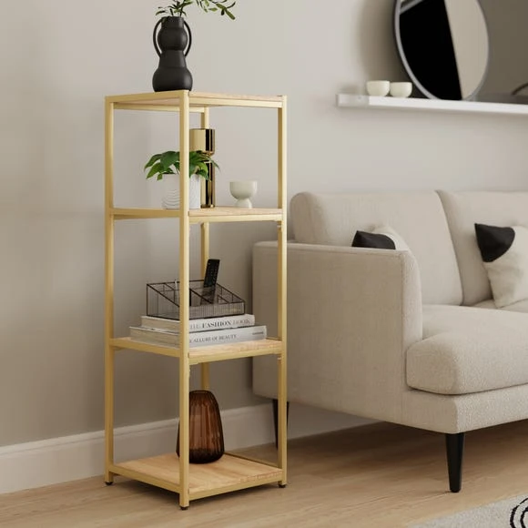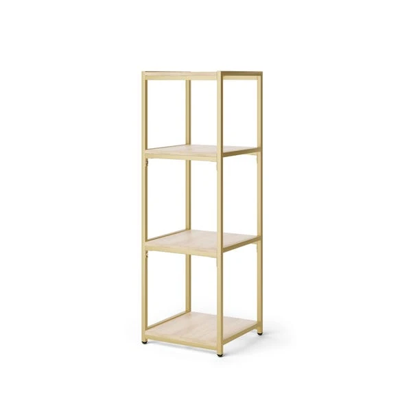 - In this bundle, you’ll receive: 1 x Modular Shelving 4 Tier Gold, 4 x Square Wood Shelf Light Oak