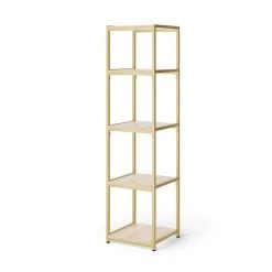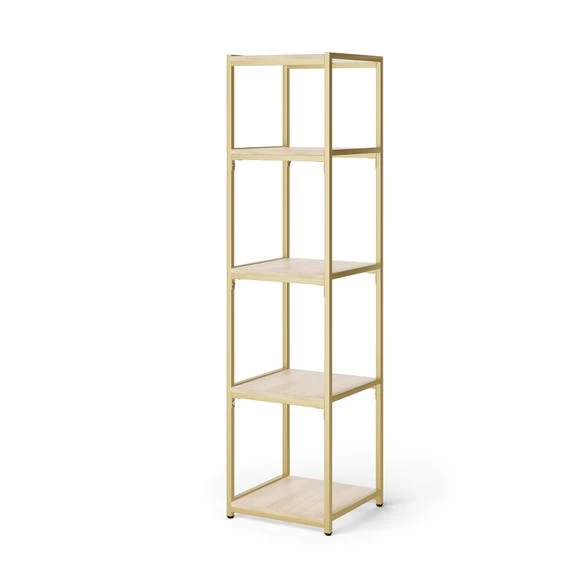 - In this bundle, you’ll receive: 1 x Modular Shelving 5 Tier Gold, 5 x Square Wood Shelf Light Oak