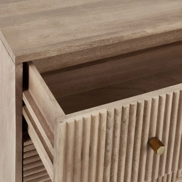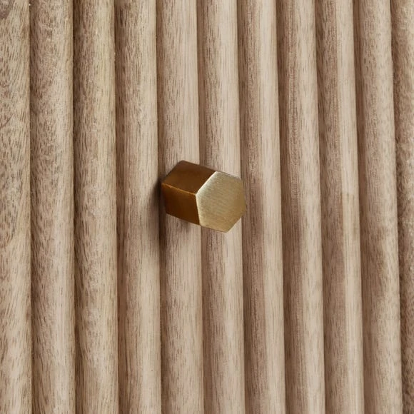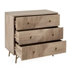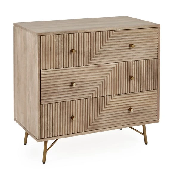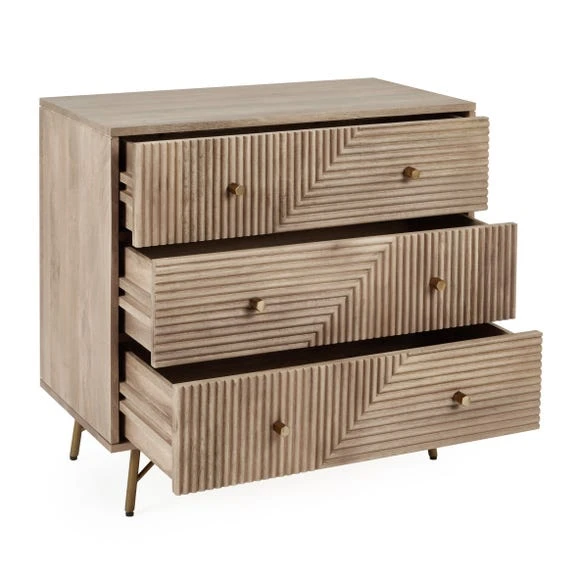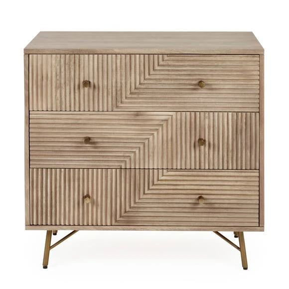 The Priya 3 Drawer Chest boasts exceptional quality, and is beautifully crafted from solid mango wood using traditional joining techniques. Adding a stunning, contemporary twist, the unique grooved design adds texture as well as a stylish look that’s sure to stand out in any home. Complete with brass finished handles and legs that complement the wood material, the Priya chest is a gorgeous way to store your clothes and items in the bedroom thanks to the 3 spacious drawers.