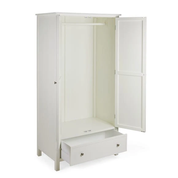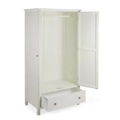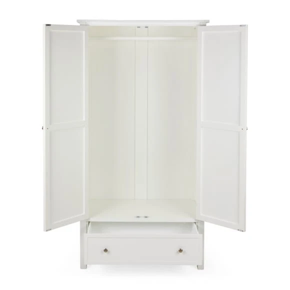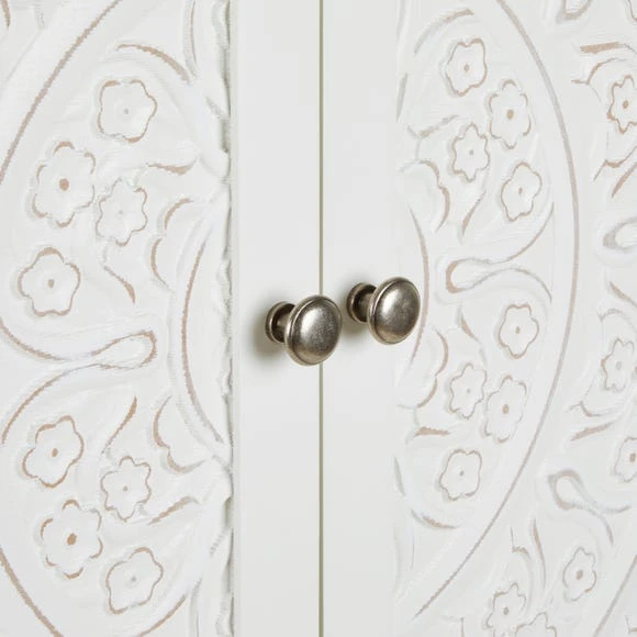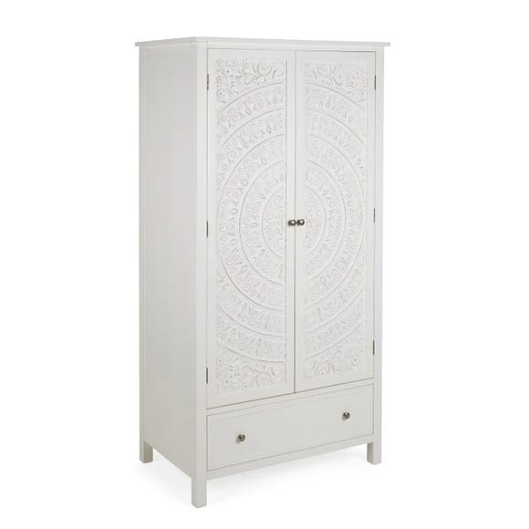 The Samira White Double Wardrobe is a stunning piece to include in any bedroom. Featuring a delicately detailed, carved out wooden front, this wardrobe provides both style and practicality without compromising on either. This carved design is brought out with the stylish paint finish, which complements the beautifully finished brushed metal handles. Finished in a timeless white colourway, the Samira Double Wardrobe features a ample room to hang up your clothes and a drawer for extra storage space.