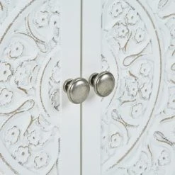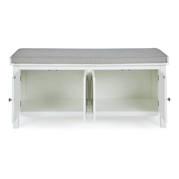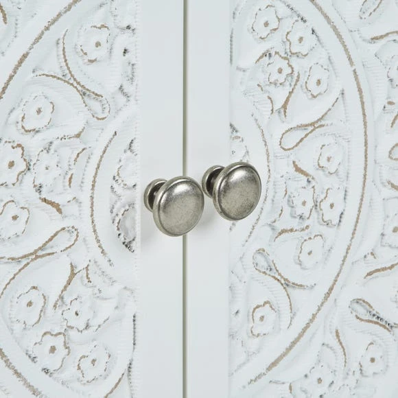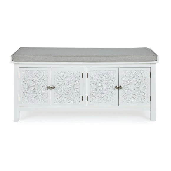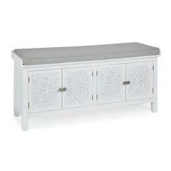 Finished in a white colourway, the Samira Storage Bench offers ample storage space inside whilst the intricate carved detailing on the front of this storage unit adds a stunning, decorative finish. The Samira bench features two large cupboard spaces as well as a comofortable cushioned seat, upholstered in a complementing fabric.