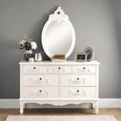 Featuring a French-inspired design with ornate floral detailing, the Toulouse range boasts a vintage look, with a distressed off-white finish. Featuring curved legs, this fully assembled dressing table will add an elegant touch to any room.