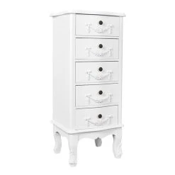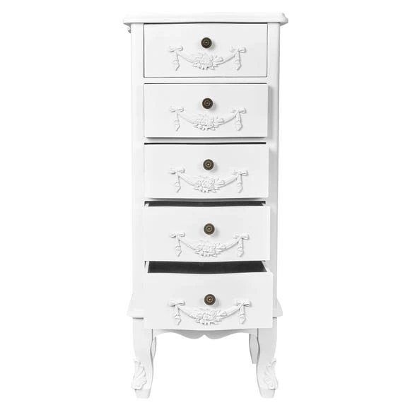 Featuring a French-inspired design with ornate floral detailing, the Toulouse range boasts a vintage look, with a distressed off-white finish. Featuring curved legs, this fully assembled chest of drawers will add an elegant touch to any room.