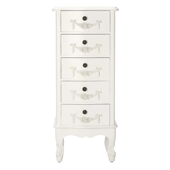 Featuring decorative detailing on the drawer fronts, this chest of drawers features a slimline, tall design. Complete with five spacious drawers with ornate bronze handles, this Tall Chest of Drawers is crafted with solid pine legs and frame for durability.