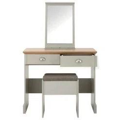 Finished in a grey colourway with a contrasting bevelled edge oak-effect top and brushed steel cup handles, the Kendal dressing table set has a design that would suit any classic or contemporary bedroom. This gorgeous self-assembly dressing table offers plenty of storage space and comes with an angled mirror and a matching cushioned stool that tucks neatly away when not in use.