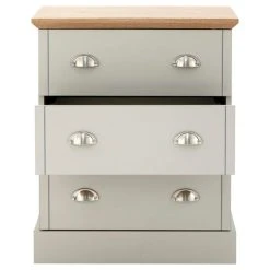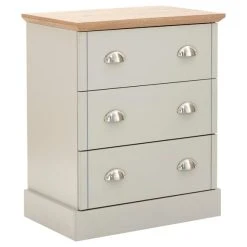 Finished in a grey colourway with a contrasting bevelled edge oak-effect top and brushed steel cup handles, the Kendal 3 drawer chest has a design that would suit any classic or contemporary bedroom. Mounted on a deep base plinth, this self-assembly chest of drawers features three evenly sized drawers with plenty of storage space.