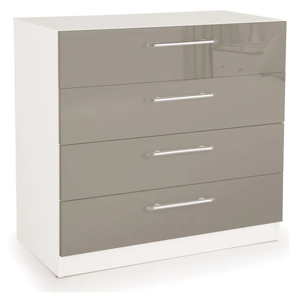 The Bayswater 4 drawer chest features 4 equally sized drawers on easy glide metal runners and durable easy grip handles. The crisp and modern Bayswater range from Harmony is certain to brighten up any bedroom with its contemporary features. The drawers have metal effect plastic handles and storage space that sit on heavy duty metal runners so will last over a number of years.
