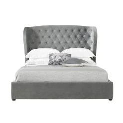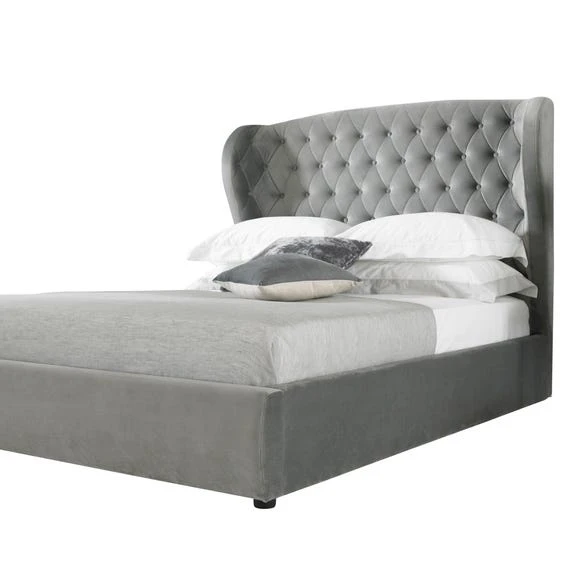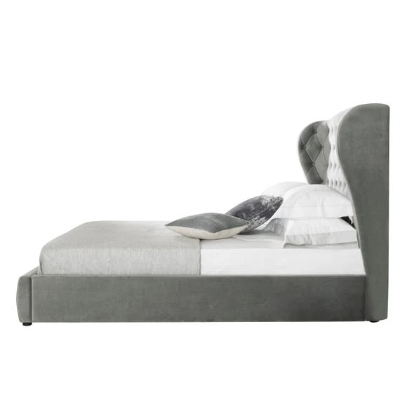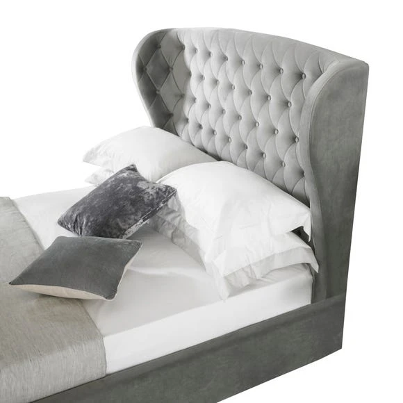 Crafted from a luxurious quilted velvet fabric in a grey colourway, the Amalfi fabric bed frame features a winged chesterfield style headboard, designed with foam cushioning and a buttoned finish to add a touch of luxury to your bedroom. This self-assembly bed frame is built with a sturdy wood and metal frame with a sprung slatted base to provide additional comfort and comes with pre-installed fittings for easy assembly.