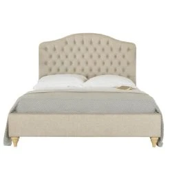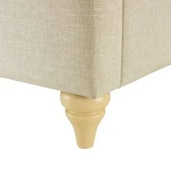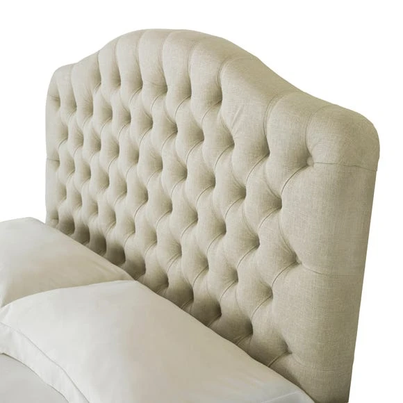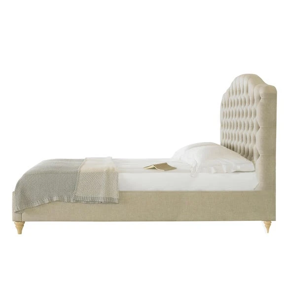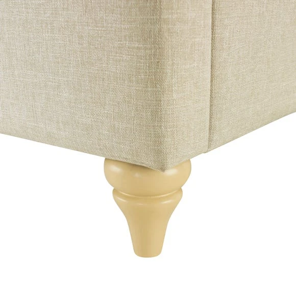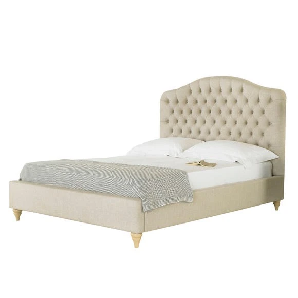 Upholstered in a beige linen effect, polyester fabric, the Balmoral Chesterfield bed frame offers a classic styling with its buttoned, foam cushioned headboard and turned feet. This self-assembly bed frame is crafted with a sturdy wood and metal frame, complete with a sprung slat base for additional comfort and comes with pre-installed fittings for easy assembly.