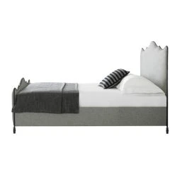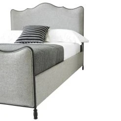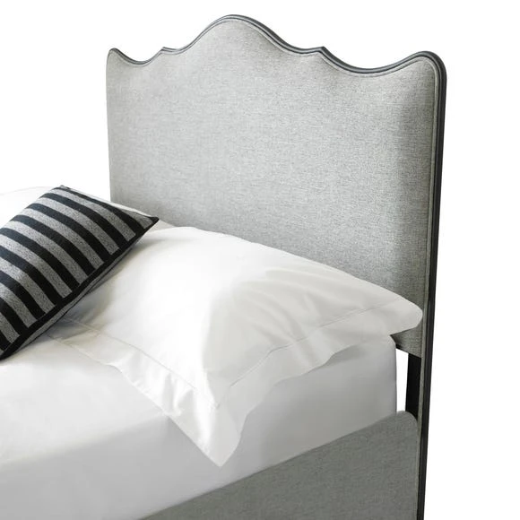 Offering a modern twist on a classic design, the elegantly crafted Cameo bed frame is upholstered in a grey, linen-effect polyester fabric and features a foam-padded headboard and footboard finished with piped edges and a stylish, contrasting metal frame.