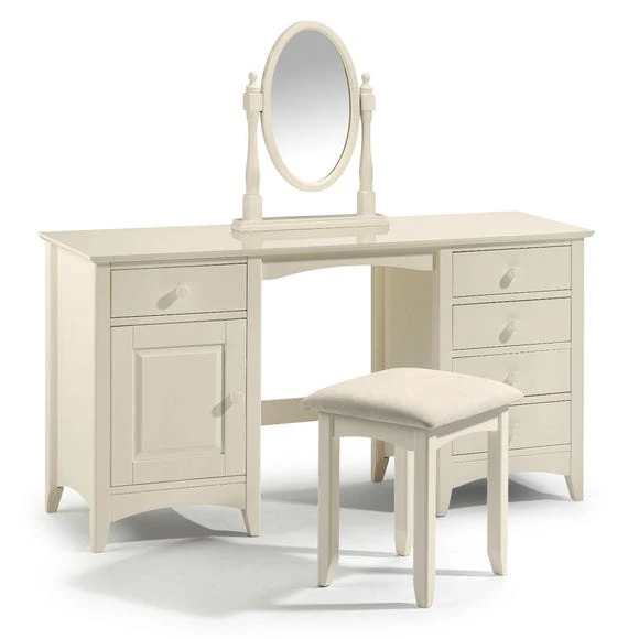 The Julian Bowen Cameo Twin Pedestal Dressing Table Well is built from high quality material to ensure durability. It features five drawers and one cupboard with contemporary designed tapered legs and solid wood handles.