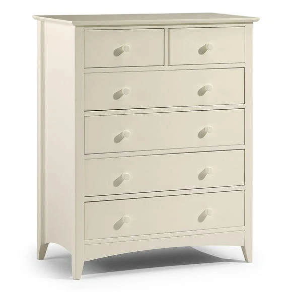 Classically designed in a shaker style, this chest of drawers features a subtle off-white, painted finish. This chest boasts generous storage with four spacious drawers and two smaller drawers.
