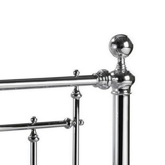 The Empress Chrome Bed Frame will make an impressive centrepiece in any bedroom. This beautifully designed chrome bed frame features clean straight lines and a high foot end with elegant detailing to match the headboard.