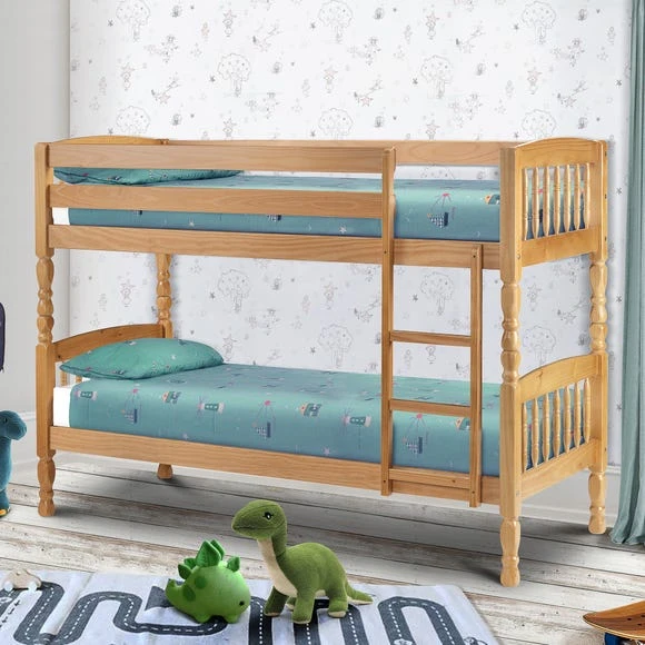 Perfect for adding some fun to your child’s bedroom, this modern pine bunk bed features a wooden construction, ladder, safety bars, and bed slats.