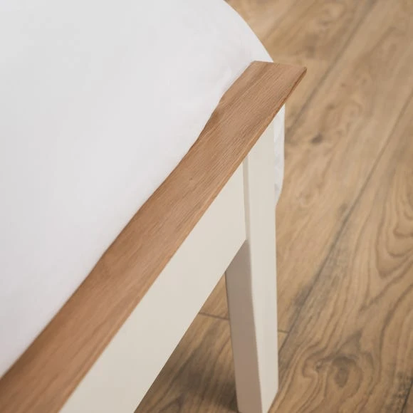 A timeless shaker-style bed frame with refined detailing finished in durable ivory lacquer with solid American White Oak cappings.