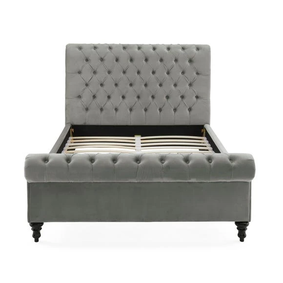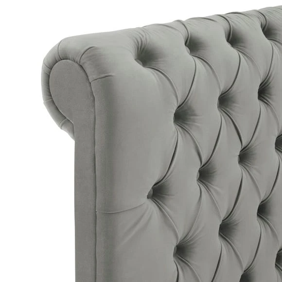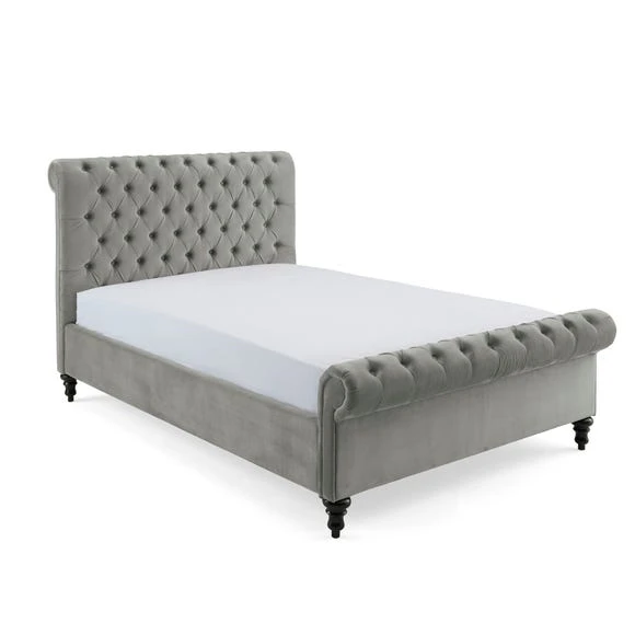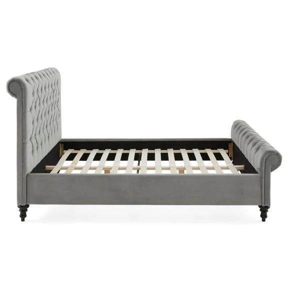 Inspired by the iconic chesterfield style, this luxurious bed frame features elegant scrolled head and footboards, complete with deep buttoning and a hand sewn finish.