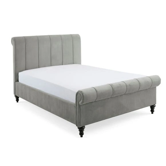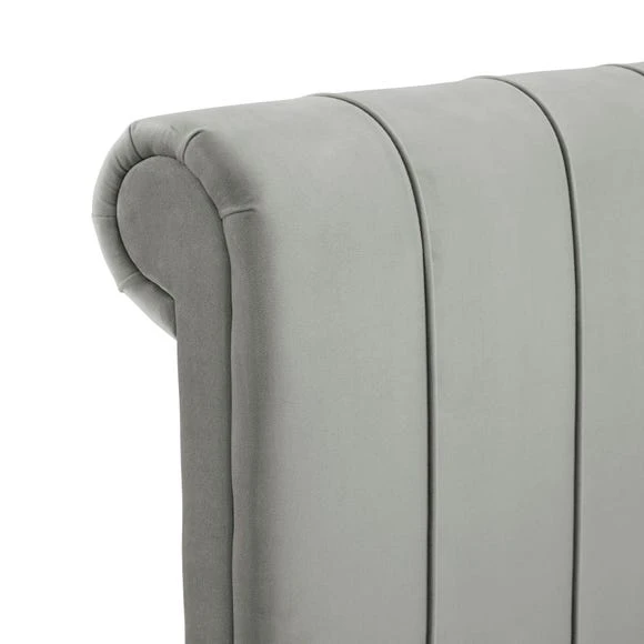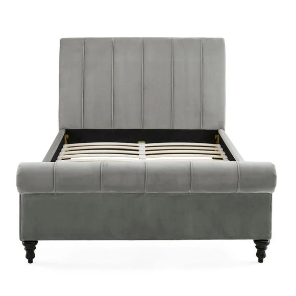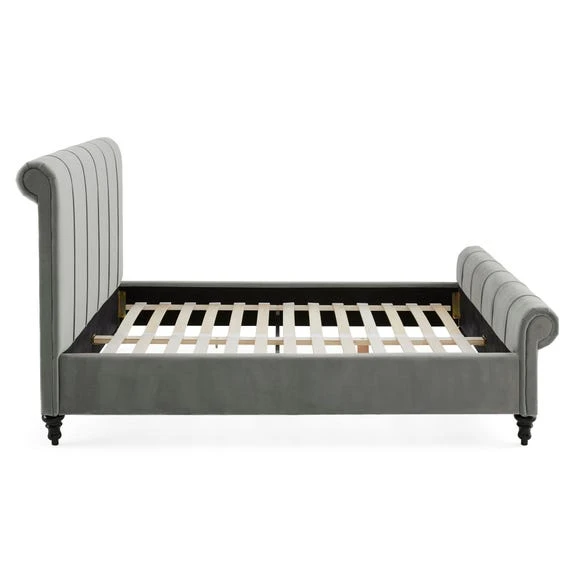Designed with a gorgeous scrolled headboard and footboard, this bed frame features a stylish pleated design with a hand sewn finish.