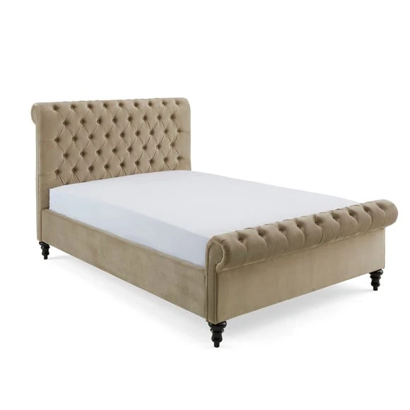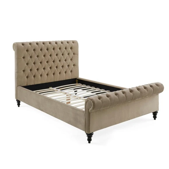 Inspired by the iconic chesterfield style, this luxurious bed frame features elegant scrolled head and footboards, complete with deep buttoning and a hand-sewn finish.