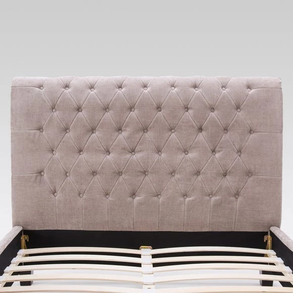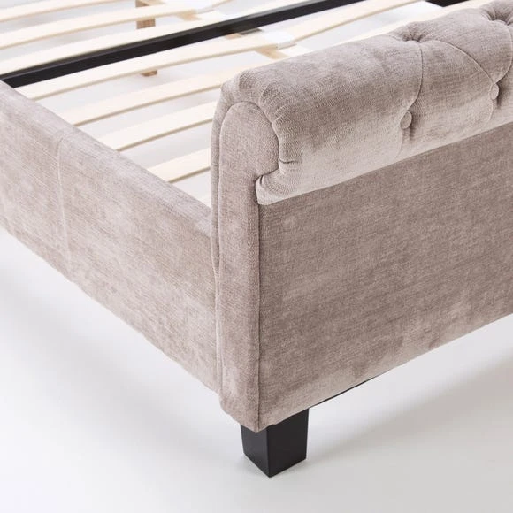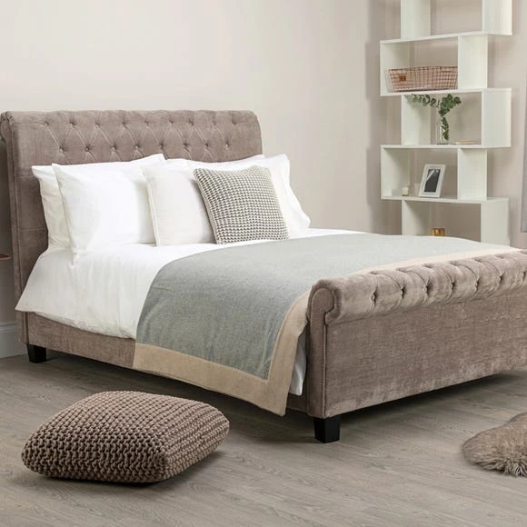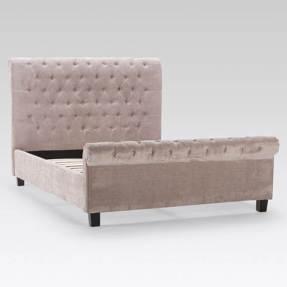 This upholstered bed frame will add a luxurious touch to any bedroom. Make a bold style statement with the Limelight Orbit Mink Velvet Upholstered Bed Frame. This modern bedstead comes in a plush velvet in a gorgeous mink finish. The extra tall scrolled headboard makes an elegant style statement when coupled with the button detailing. Features a beech sprung slatted base for extra comfort.