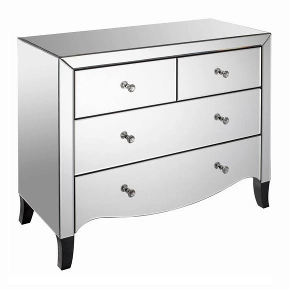 Add some modern glamour to any home with the new Valentina mirrored bedroom furniture range. As well as beautiful looks, the Valentina 4 Drawer Chest also boasts functionality with ample storage space.