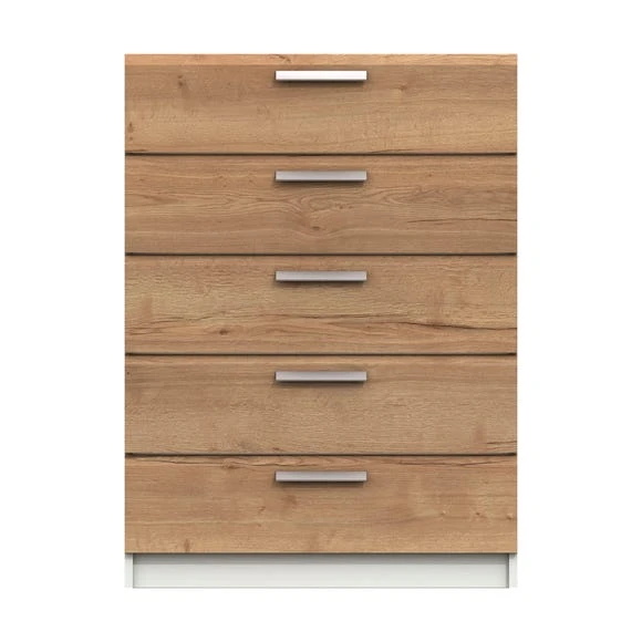 The Piper 5 Drawer Chest offers a contemporary styling that would make a great addition to any home. The Piper boasts a realistic wood grain effect finish, coupled with stylish designer metal handles to accenturate the distinctive 45 degree profile on the doors and drawers. This chest of drawers is supplied fully assembled and comes with five large drawers, complete with linen look insides, 8mm heavy duty drawer bases and easy glide metal runners.