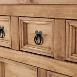 Store all your bedroom bits and pieces, like jewellery, with the Corona Merchant Chest. It features four small drawers near the top, three medium sized drawers in the middle and two large drawers near the bottom, all boasting an evocative Mexican design with stunning metal handles and buttons.