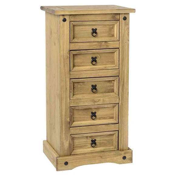The Corona 5 Drawer Tall Chest boasts ample storage for your bedroom. This beautiful distressed waxed pine chest will bring a whole new look to your home. The attractive design with metal drop handles and the rich colour of the wood make it a superb piece of furniture to look at that is also highly functional. With five spacious drawers, there’s plenty of room to store your belongings. Installation Note: This product should be fixed to a wall using a wall fastener