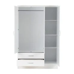 The Nevada Triple 2 Drawer Mirrored Wardrobe features a contemporary design owing to the gloss finished front which contrasts perfectly with the light oak veneers. The Nevada has your storage needs covered thanks to the 2 drawers, top shelf and hanging space from the metal rail.