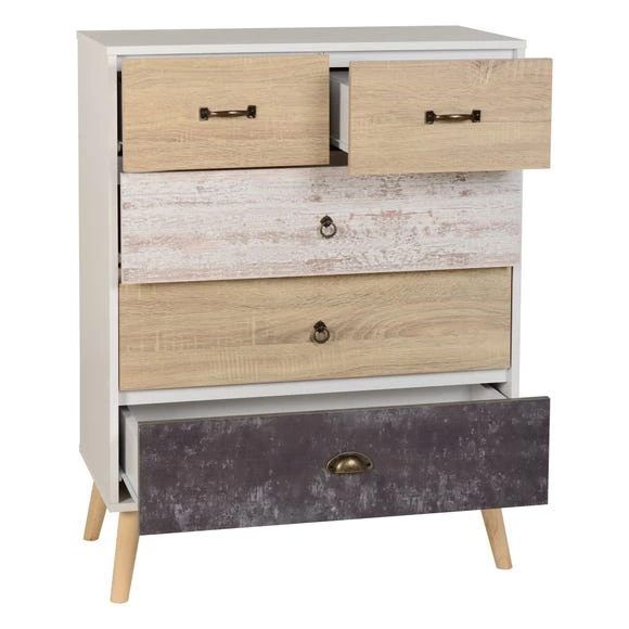 Crafted with a striking, characterful look, the Nordic chest of drawers offers a quirky take on a classic design. This self-assembly chest comes complete with Scandi-style legs and is finished in a white colourway with distressed drawer fronts, each with a unique finish and handle style.