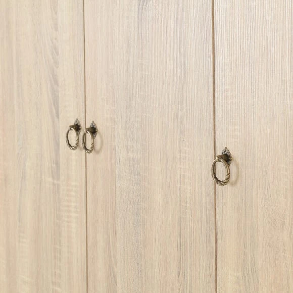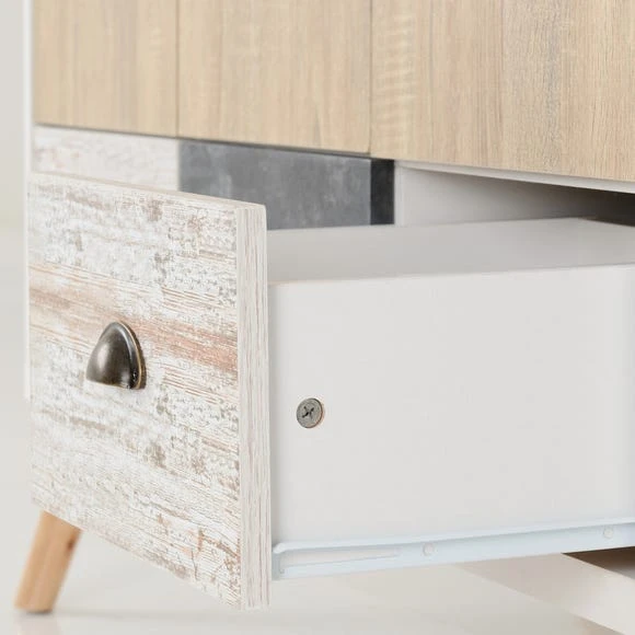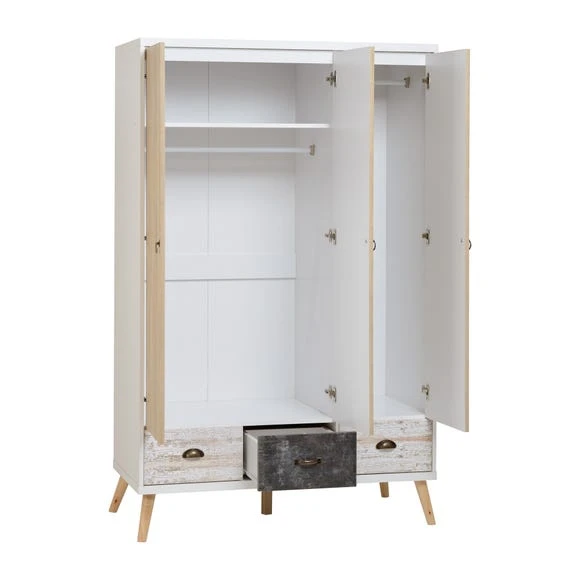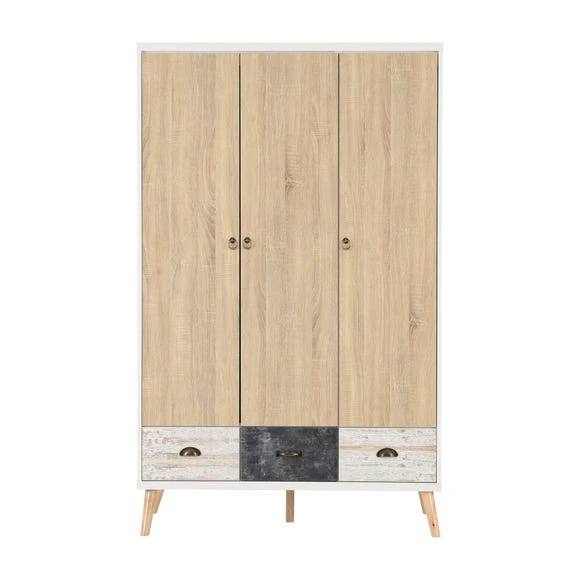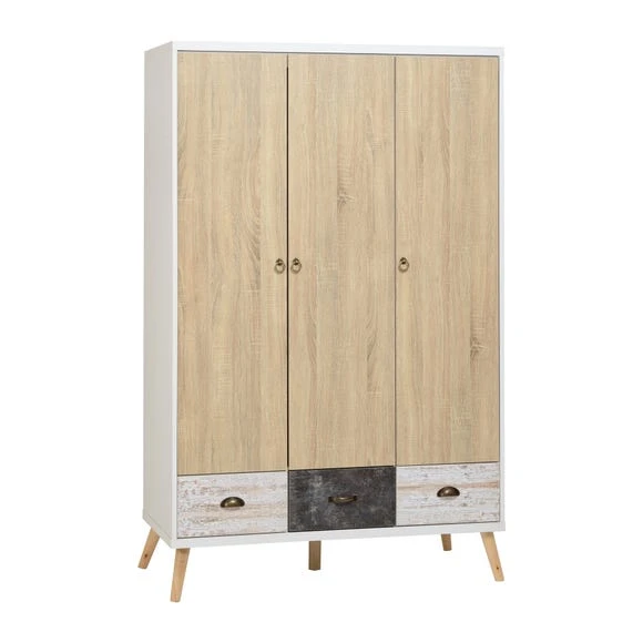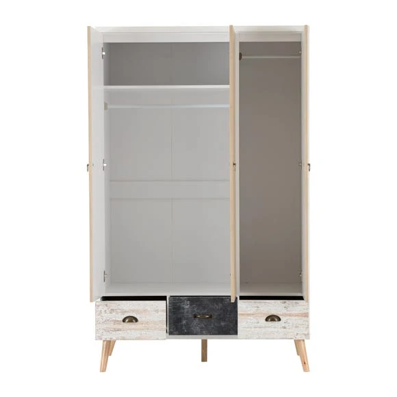 Crafted with a striking, characterful look, the Nordic triple wardrobe offers a quirky take on a classic design. This self-assembly wardrobe comes complete with Scandi-style legs and is finished in a white colourway with distressed drawer and door fronts, each with a unique finish and handle style.
