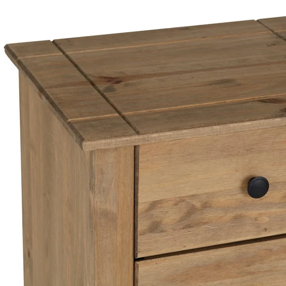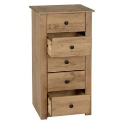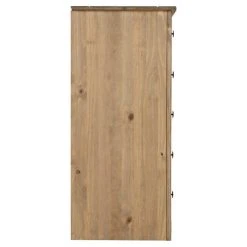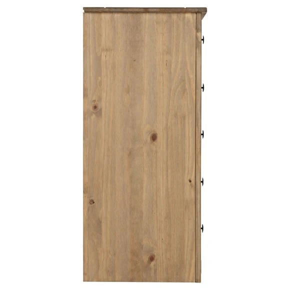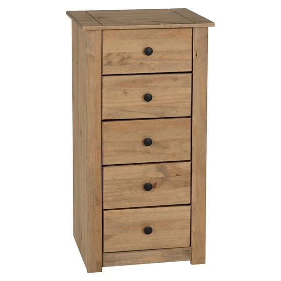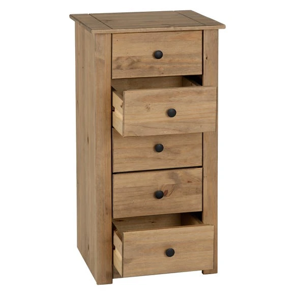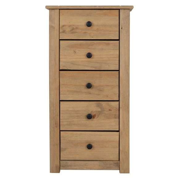 The tall Panama 5 Drawer Chest boasts a light natural aax finish and black metal hinges and handles which contrast each other beautifully. The five drawers offer plenty of storage space and will add rustic style to your home.