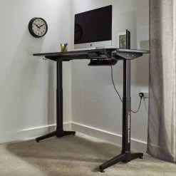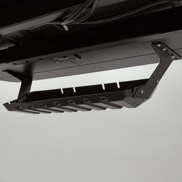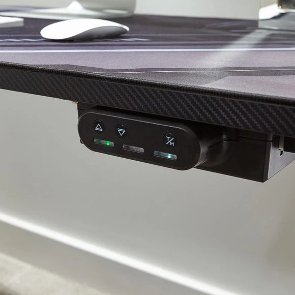 Give your legs a stretch with the versatile and multifunctional X Rocker Stratos Dual Motor Height Adjustable Gaming Desk. With the smooth E-LYFT dual motor system for electrical height adjustment, the Stratos gaming desk can easily transition between 74.5cm and 123.5cm with the press of a button. The desk also features an intelligent memory function with two programmable height settings so you can quickly find your optimal height whether you like to sit or prefer to stand at your desk. Rest assured your gear is safe and stable, as the heavy-duty aluminium construction forms a solid foundation and cool grey carbon fibre finish creates a smooth desk surface. To complete this fantastic look, X Rocker has included a super cool mouse mat to provide a smooth, easy glide surface and the Stratos Desk is designed with 2 cable management port holes, a headset hook and cup holder to free up your space and keep messy wires away.